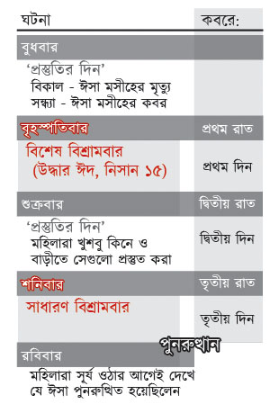 ইঞ্জিলে বলা হয়েছে যে মহিলাগুলো কবরে চলে এসেছে "ভোর বেলায়, অন্ধকার থাকতেই" (ইউহোন্না ২০:১; লূক ২৪:১), এবং তাদের আসার আগেই ঈসা পুনরুত্থিত হয়েছিলেন। এটা সাধারণ চিন্তায় কবরে 'তিন রাত তিন দিন' হয়।