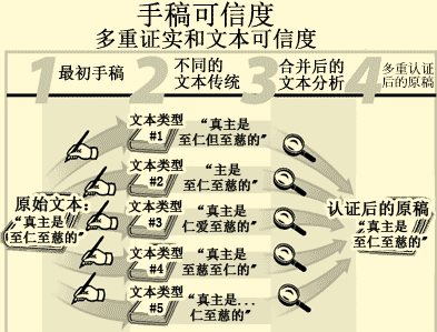 在法庭上,三个单独与案件相关的证人的证词比一个人的证词更可信。在评价手抄本时,也应该使用同样的原则。完全独立存在的“抄本”越多,才更能确定原始文本的内容。相反,如果只有一个“抄本”存在,就不容易确定原始文本的内容。即使是原始文本的不同译本,也可以帮助更容易地确定原始文本内容。下方的图表就能说明这一点,图表使用了假设的句子——“真主是仁慈和怜悯的”,变化出更多说法: