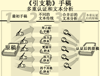 《引支勒》现存大量的“抄本”和最早手抄译本(见图表);拜占庭、西方、西乃、科普特、亚美尼亚、埃塞俄比亚和叙利亚抄写链: