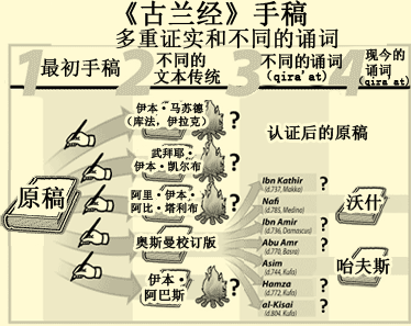 从伊斯兰的历史中,我们知道在各国各省有独立的教授《古兰经》的学校,由穆罕默德(求主福安之)所称道的最好的诵经家(Qurra)们领导:伊本·马苏德、武拜耶·本·凯尔布,阿里·伊本·阿比·塔利布和伊本·阿巴斯。当奥斯曼收集到第一个官方版《古兰经》时,这些权威的版本与他的不同,奥斯曼便强行烧毁了他们的版本。虽然他们的部分文本被当时著名的穆斯林学者逐字引述到了古典评论和著作之中,但整个版本全部被烧毁或丢失。从奥斯曼的原始文本,产生了七种读经或诵经方式,但只有哈夫斯和沃什今天依然存在。如下图: